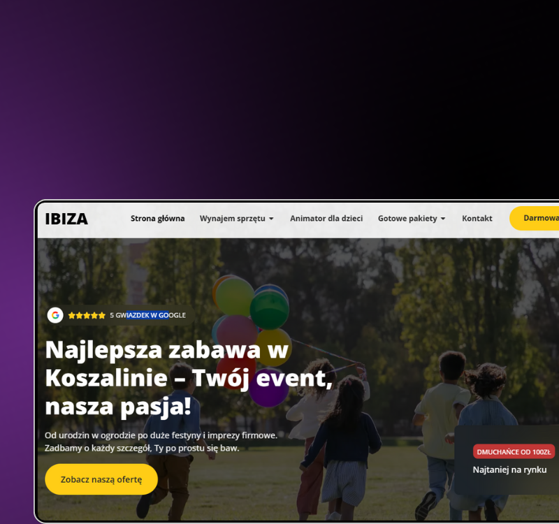 Na koniec zoptymalizowaliśmy wszystko pod lokalne wyszukiwania – tak, by nowy biznes mógł szybko zaistnieć w Google pod hasłami typu „dmuchańce Koszalin”, „wynajem atrakcji na festyn”, „organizacja imprez plenerowych”.